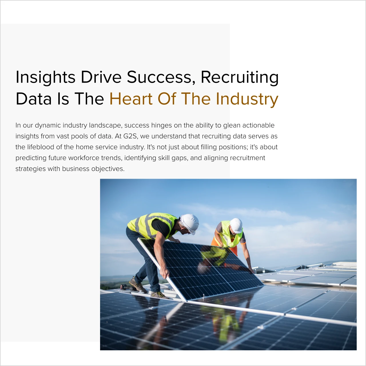 Manual processes, resume screening bias, and lagging technology have slowed down growth in industries that need talent fast. Companies lacked visibility into skill gaps, geographic labor trends, and the true ROI of their recruiting strategies. We helped G2S define these challenges clearly so they could speak directly to the pain points that matter—and position themselves as the strategic answer.